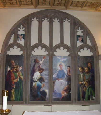The painting, here pictured, is Pentecost, painted by Peter William GRAY, a Sulpician artist who resides in Baltimore, Maryland. Inspired by the Pentecost scene painted in the seventeenth century by Charles Le Brun at the request of Father Jean-Jacques OLIER, Father Gray’s version also shows Mary humbly in the center of the apostles, all receiving the gift of the Holy Spirit in tongues of fire. For Father Olier, having the image of Pentecost prominently displayed in the seminary chapel reminded the seminarians and priests of the apostolic mission to which they are called.